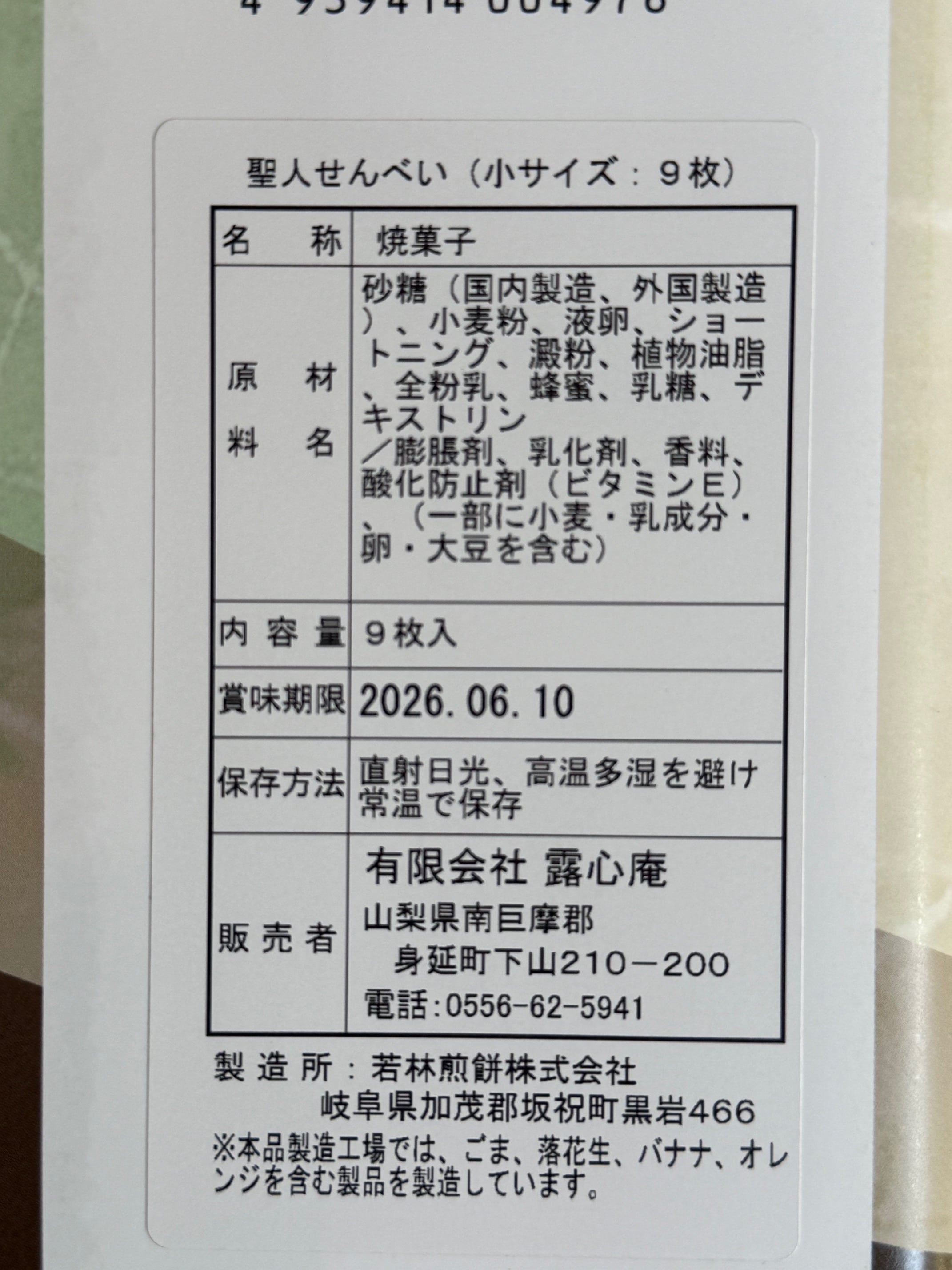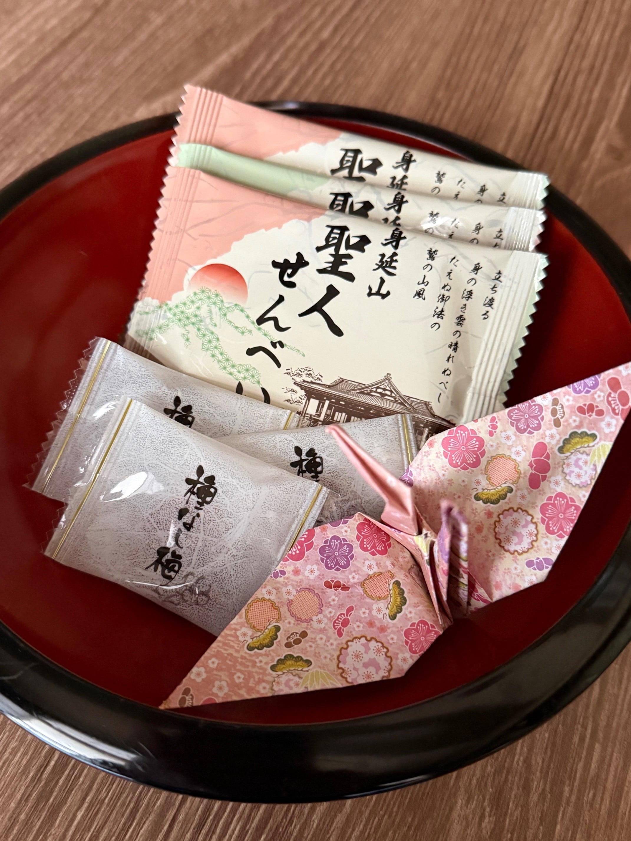 日蓮宗の宗紋と久遠寺の寺紋がプリントされたゴーフル。