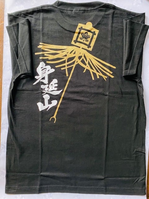 黒字のTシャツで 表は無地、背中側には白字で「身延山」の文字と