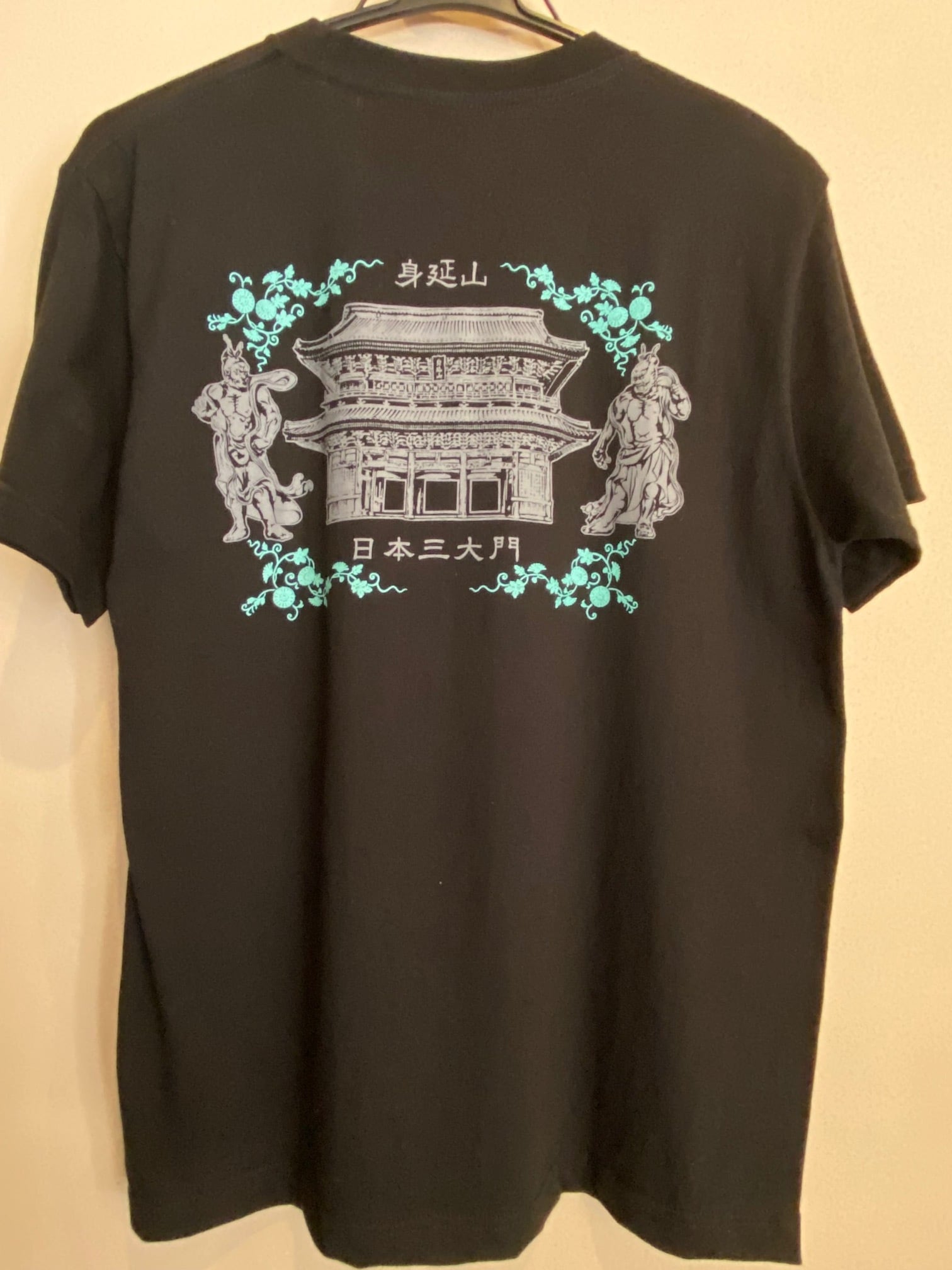 黒字のTシャツで 表は左胸に仁王様、背中には【身延山三門】と【仁王様】の絵と